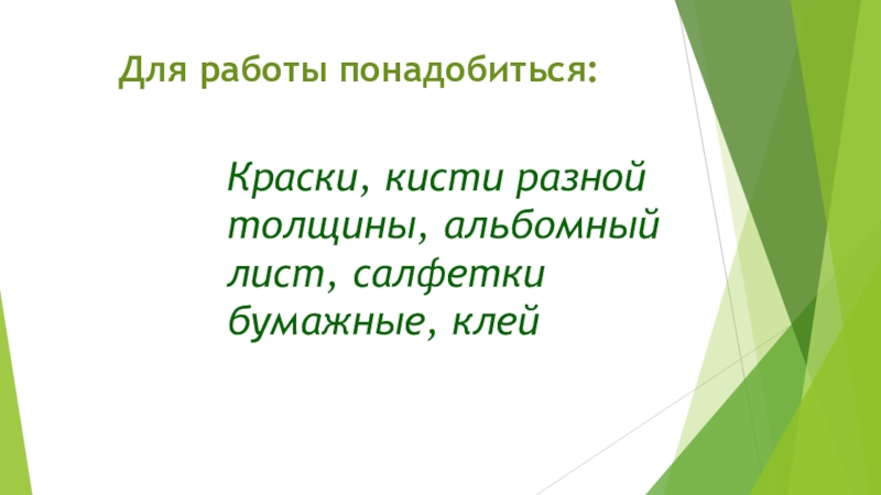 Для работы понадобиться: Краски, кисти разной толщины, альбомный лист, салфетки бумажные, клей