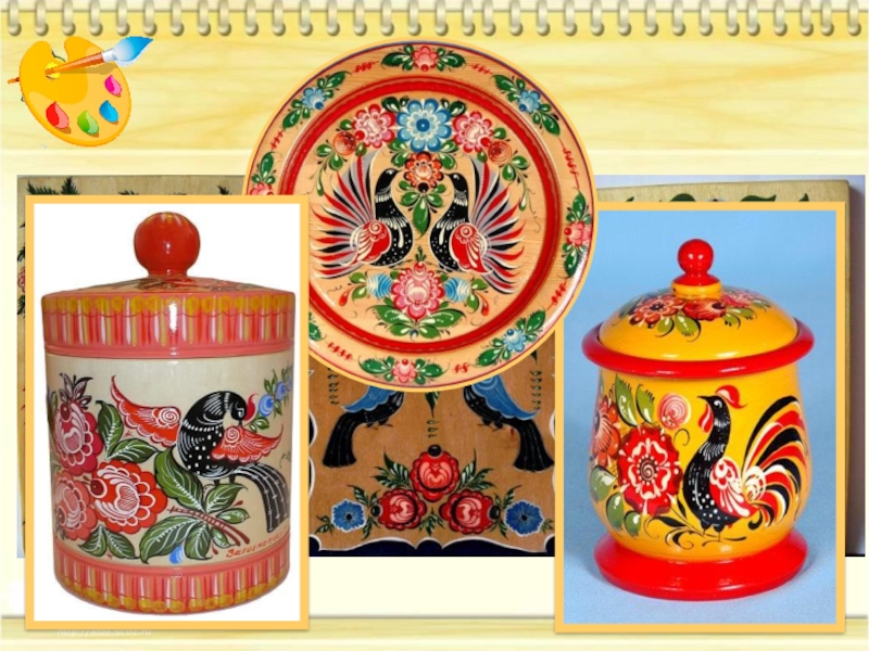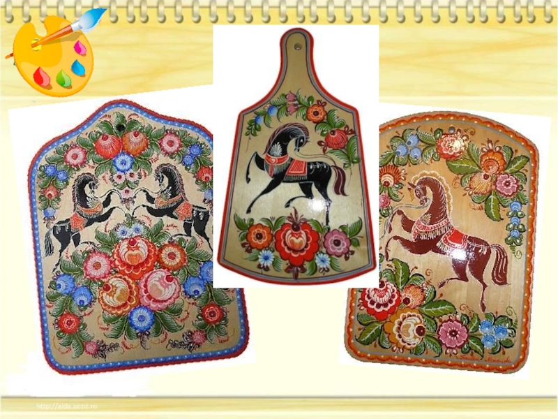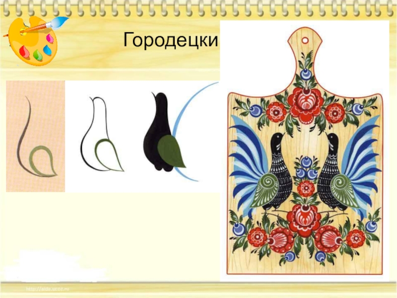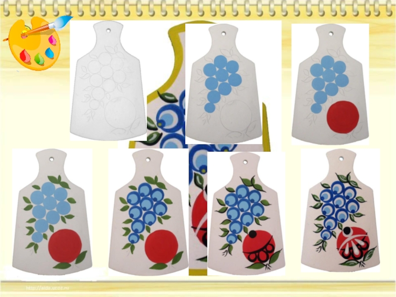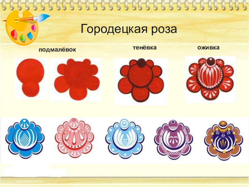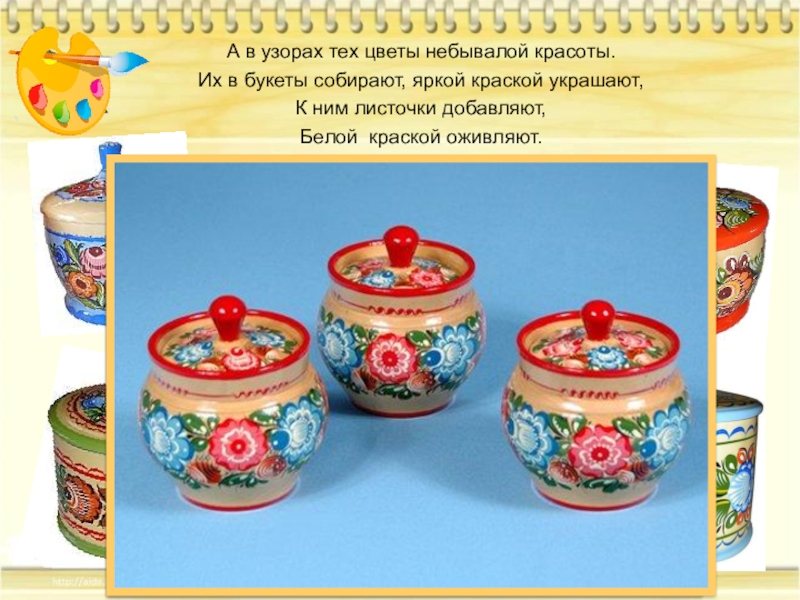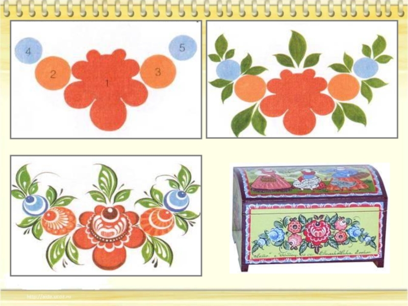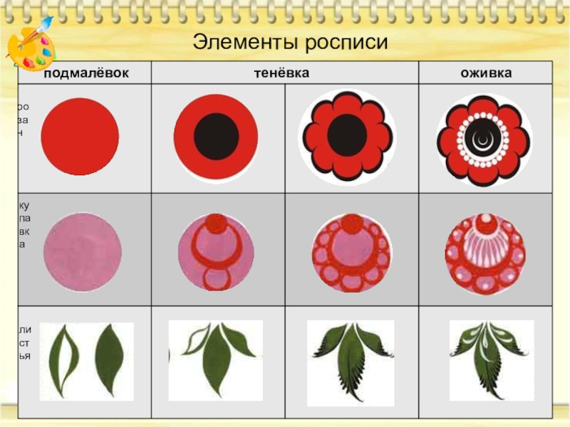 Третий этап — оживка (или разживка), т.е. тонкая разделка орнаментальных форм белилами. Оживки всегда наносят на однотонные силуэты, что придает им некоторую объемность.
