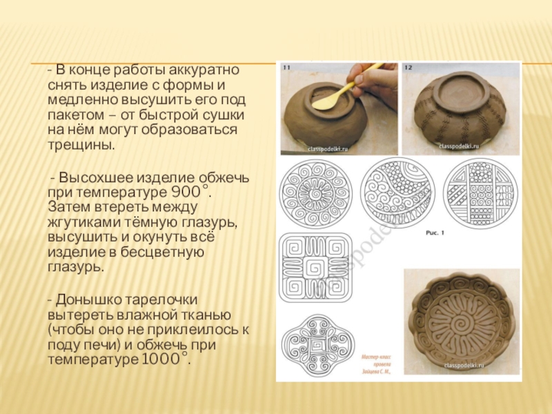 5 Такое изделие отличается хрупкостью, поэтому его не надо трогать без необходимости, в том числе и на этапе сушки. Если изделие крупное, лучше не притрагиваться к нему до момента обжига.