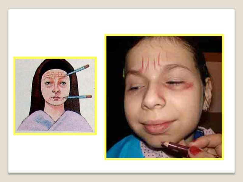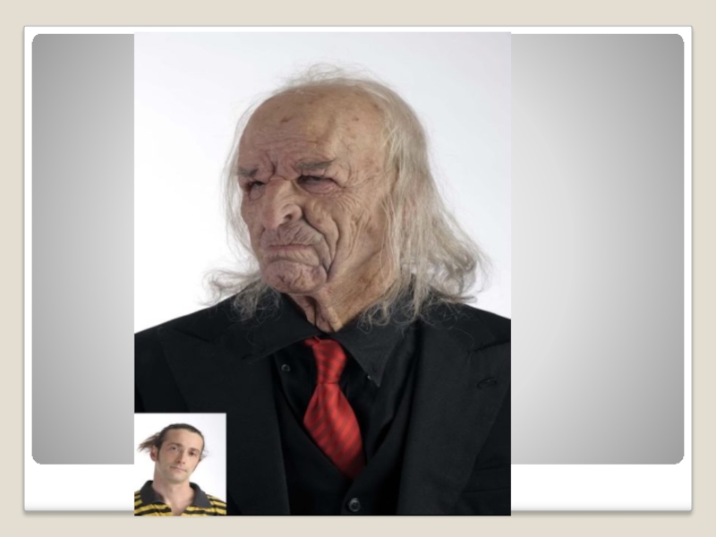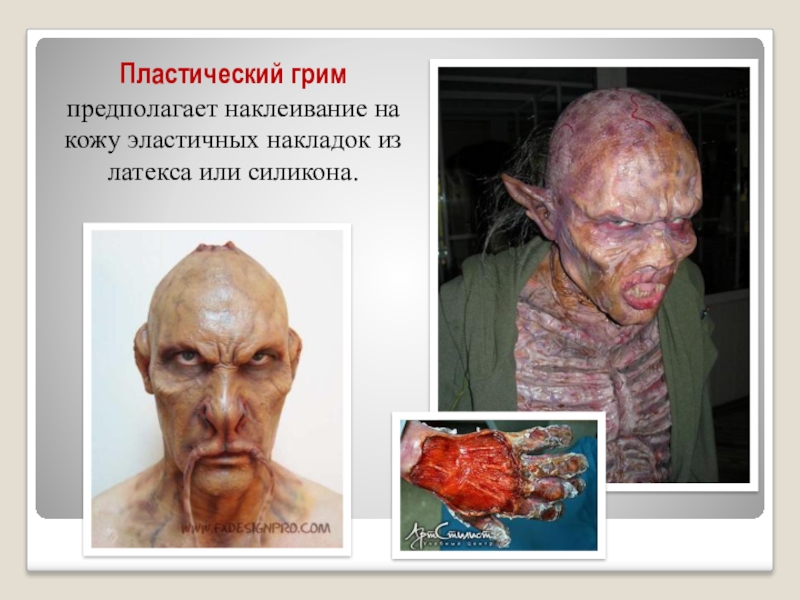 Слайд 6Пластический грим предполагает наклеивание на кожу эластичных накладок из латекса или