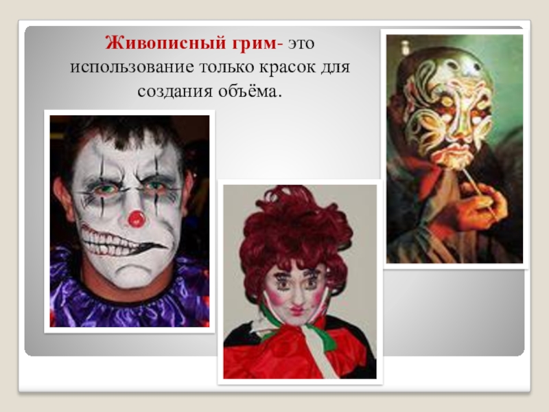 Слайд 4Живописный грим- это использование только красок для создания объёма.