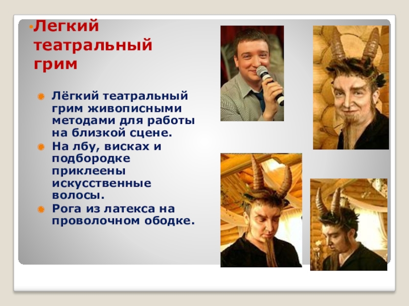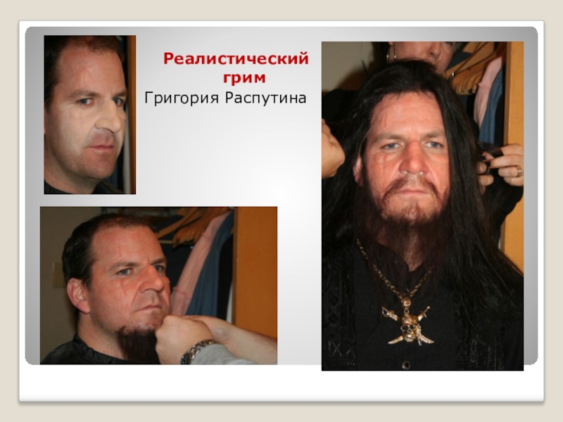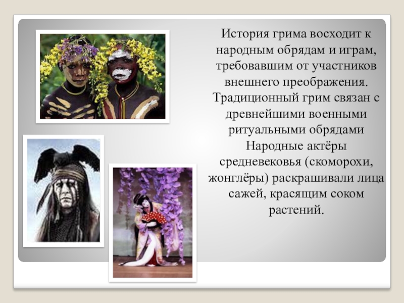 Слайд 3История грима восходит к народным обрядам и играм, требовавшим от участников внешнего преображения. Традиционный