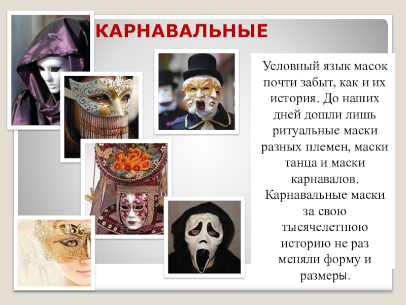 дней дошли лишь ритуальные маски разных племен, маски танца и маски карнавалов.  Карнавальные маски за свою тысячелетнюю историю не раз меняли форму и размеры.