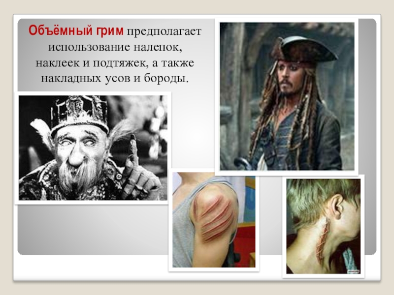 Слайд 5Объёмный грим предполагает использование налепок, наклеек и подтяжек, а также накладных