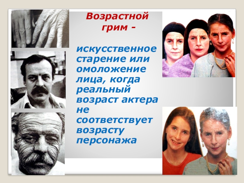 искусственное старение или омоложение лица, когда реальный возраст актера не соответствует возрасту персонажа