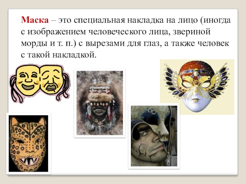 Слайд 23Маска – это специальная накладка на лицо (иногда с изображением человеческого