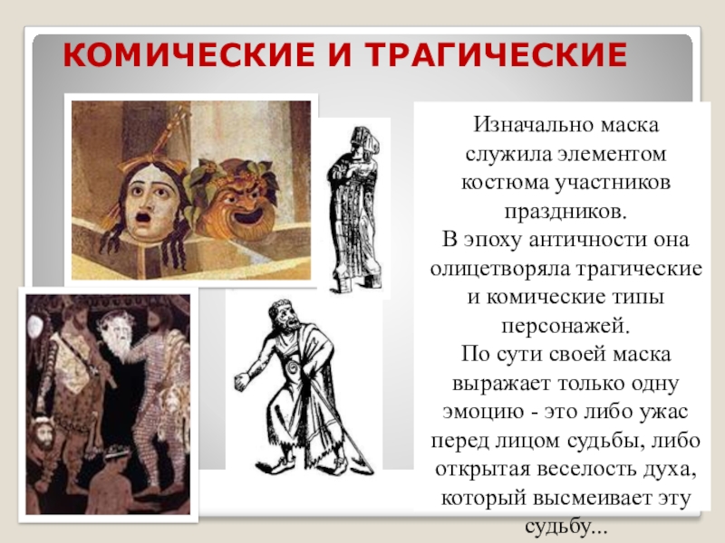 КОМИЧЕСКИЕ И ТРАГИЧЕСКИЕИзначально маска служила элементом костюма участников праздников. В эпоху античности она олицетворяла трагические и комические