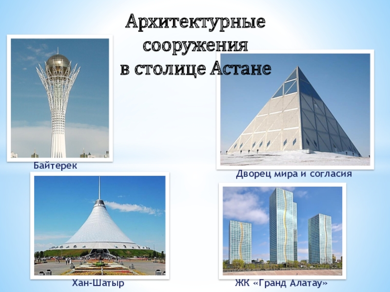 Дворец мира и согласияАрхитектурные сооруженияв столице АстанеБайтерекХан-Шатыр ЖК «Гранд Алатау»