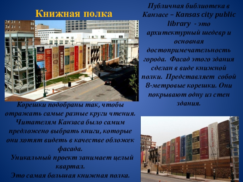Корешки подобраны так, чтобы отражать самые разные круги чтения. Читателям Канзаса было самим предложено выбрать книги, которые они хотят видеть в качестве обложек фасада.