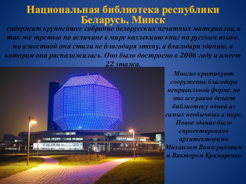 Многие критикуют сооружение благодаря неправильной форме, но это все равно делает библиотеку одной из самых необычных в мире. Новое здание было спроектировано архитекторами Михаилом Виноградовым и Виктором Крамаренко