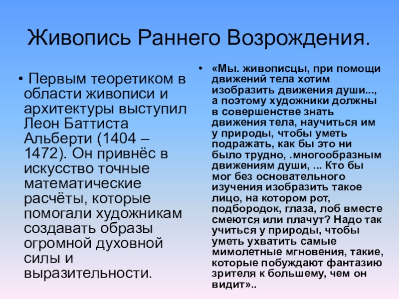 «Мы. живописцы, при помощи движений тела хотим изобразить движения души..., а поэтому художники должны в совершенстве знать движения тела, научиться им у природы, чтобы уметь подражать, как бы это ни было трудно, .многообразным движениям души, ... Кто бы мог без основательного изучения изобразить такое лицо, на котором рот, подбородок, глаза, лоб вместе смеются или плачут? Надо так учиться у природы, чтобы уметь ухватить самые мимолетные мгновения, такие, которые побуждают фантазию зрителя к большему, чем он видит»..