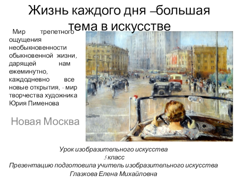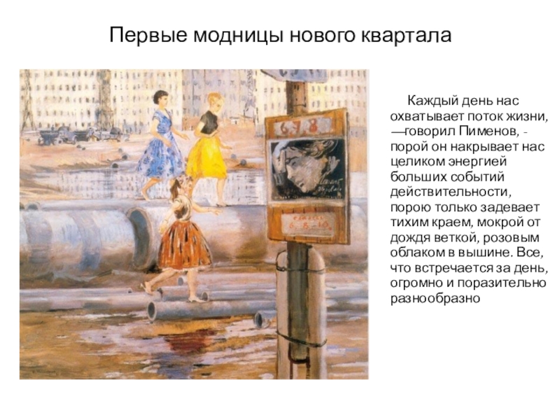 Юрия Пименова, женщины предстают перед нами в обычных будничных платьях, на обычных будничных улицах города. Но у художника Пименова есть волшебный дар: запечатлеть в обыкновенном поэтическое и прекрасное, увидеть в обыденном красоту и свет