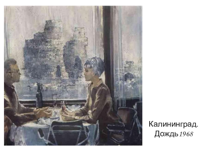 особая тема в творчестве Юрия Пименова. «Калининград. Дождь», «Ливень», «Проливной дождь», «Начало любви», «Ожидание» и еще много картин – где-то дождь просто фон, где-то главный герой. «Люблю дождь, - говорил художник. - Люблю это состояние природы. В лужах зябко отражаются облетающие деревья, белые глазурные плащи, черные мокрые зонты. Пелена дождя хлестанет по углу дома, по размокшим афишам, по сырым листьям на тротуаре, и вдруг за серой сеткой дождя откроется город»