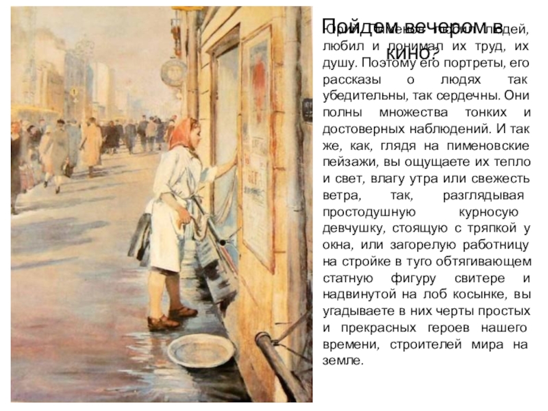 труд, их душу. Поэтому его портреты, его рассказы о людях так убедительны, так сердечны. Они полны множества тонких и достоверных наблюдений. И так же, как, глядя на пименовские пейзажи, вы ощущаете их тепло и свет, влагу утра или свежесть ветра, так, разглядывая простодушную курносую девчушку, стоящую с тряпкой у окна, или загорелую работницу на стройке в туго обтягивающем статную фигуру свитере и надвинутой на лоб косынке, вы угадываете в них черты простых и прекрасных героев нашего времени, строителей мира на земле.