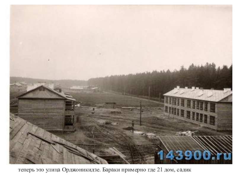 Слайд 13теперь это улица Орджоникидзе. Бараки примерно где 21 дом, садик