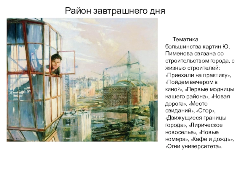 Тематика большинства картин Ю. Пименова связана со строительством города,