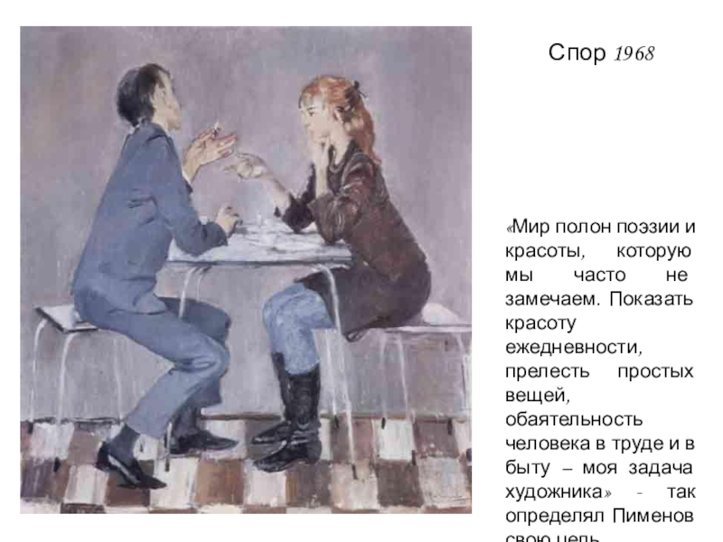 Показать красоту ежедневности, прелесть простых вещей, обаятельность человека в труде и в быту – моя задача художника» - так определял Пименов свою цель