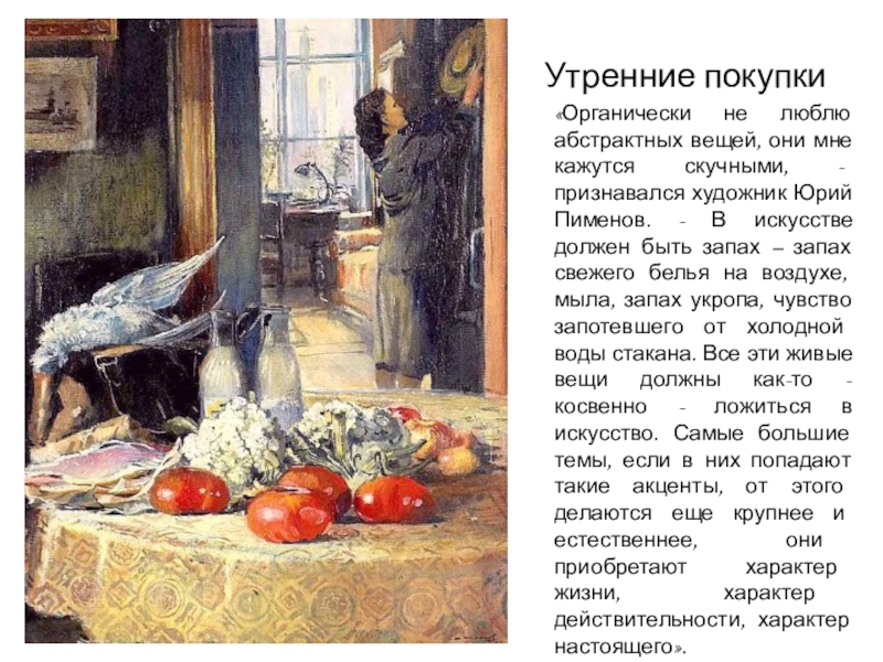 признавался художник Юрий Пименов. - В искусстве должен быть запах – запах свежего белья на воздухе, мыла, запах укропа, чувство запотевшего от холодной воды стакана. Все эти живые вещи должны как-то - косвенно - ложиться в искусство. Самые большие темы, если в них попадают такие акценты, от этого делаются еще крупнее и естественнее, они приобретают характер жизни, характер действительности, характер настоящего».