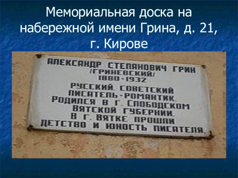 Слайд 19Мемориальная доска на набережной имени Грина, д. 21, г. Кирове