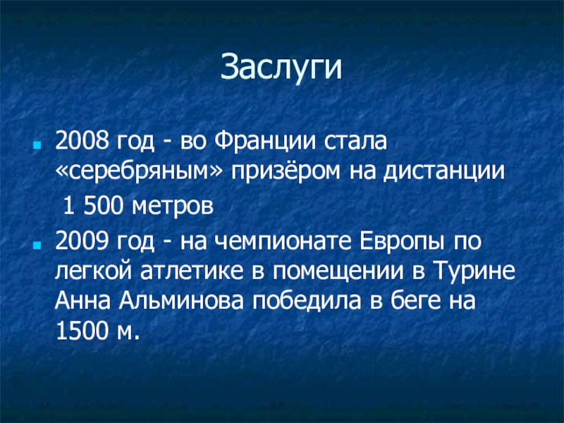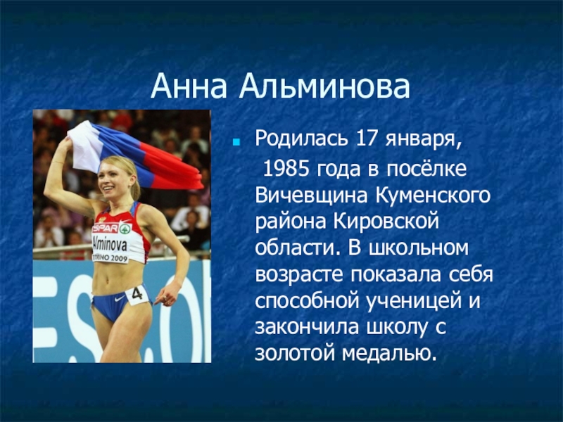 2009 год - на чемпионате Европы по легкой атлетике в помещении в Турине Анна Альминова победила в беге на 1500 м.