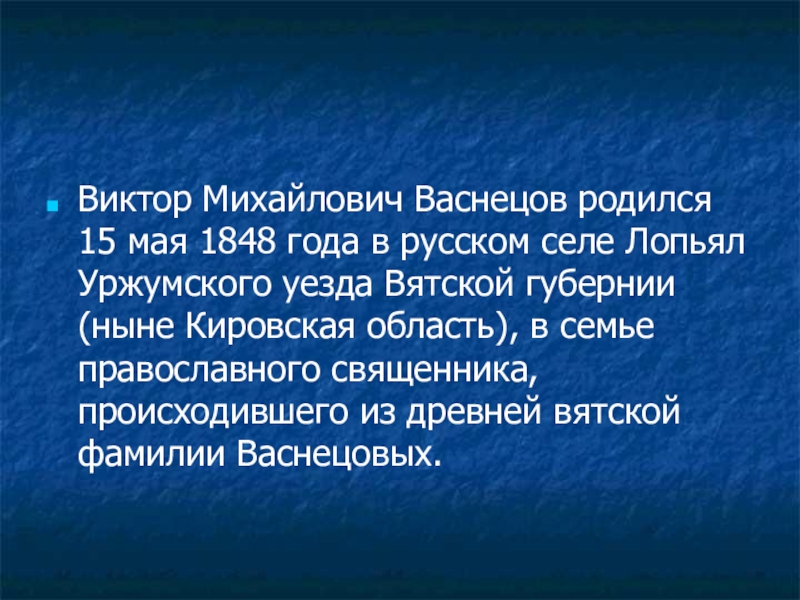 Виктор Михайлович Васнецов родился 15 мая 1848 года в русском селе