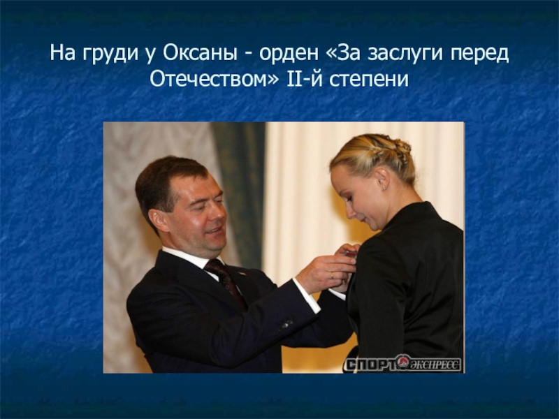 Слайд 41На груди у Оксаны - орден «За заслуги перед Отечеством» II-й