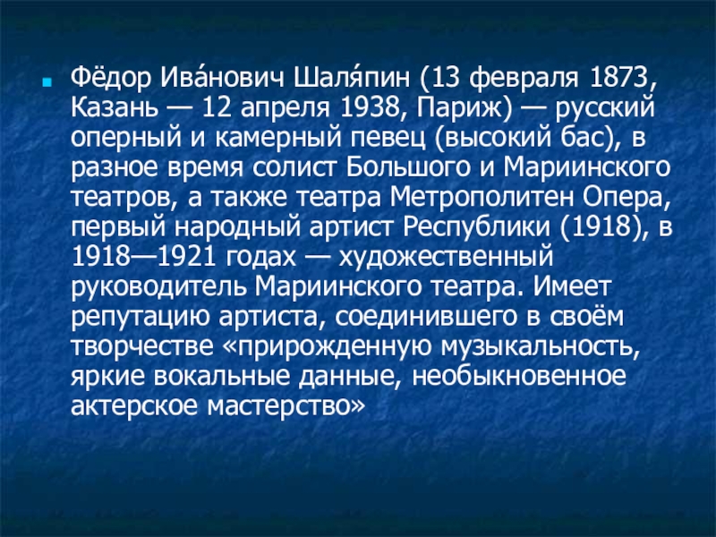 Слайд 23Фёдор Ива́нович Шаля́пин (13 февраля 1873,Казань — 12 апреля 1938, Париж)