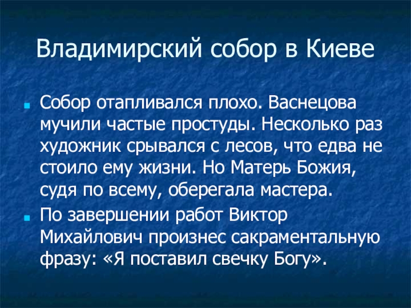Собор отапливался плохо. Васнецова мучили частые простуды. Несколько