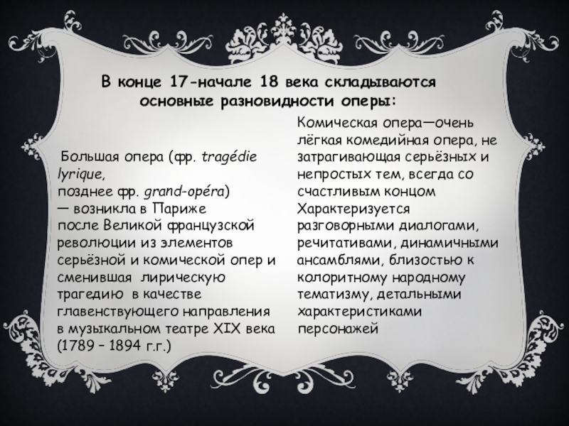 Слайд 9В конце 17-начале 18 века складываются основные разновидности оперы: