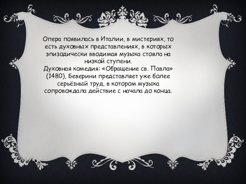 Слайд 5Опера появилась в Италии, в мистериях, то есть духовных представлениях, в которых