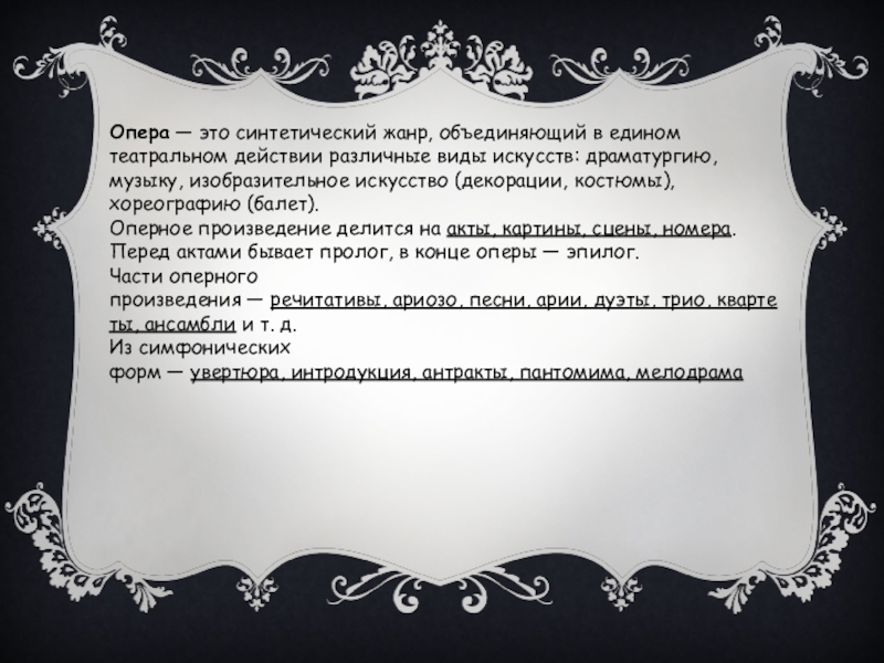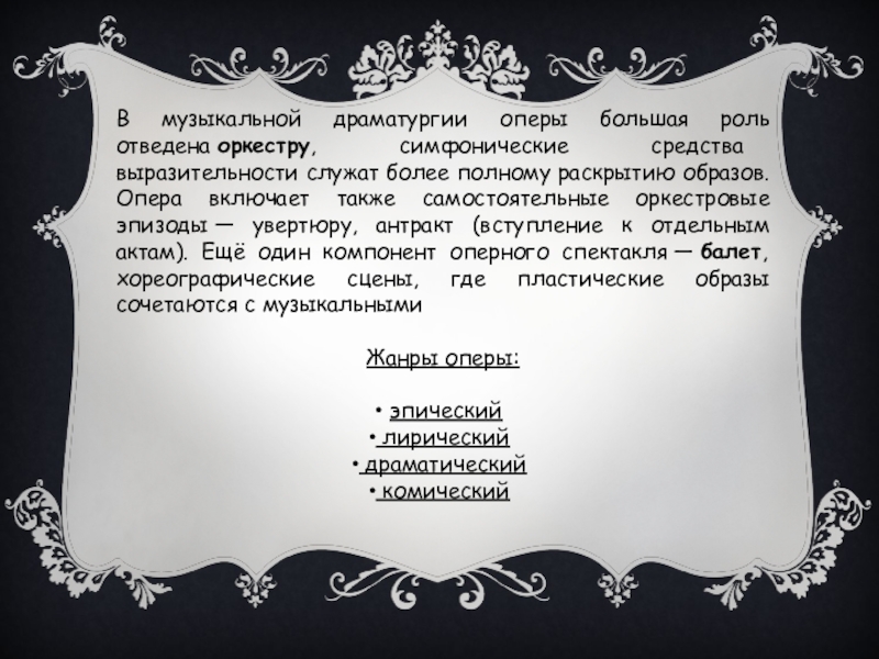 более полному раскрытию образов. Опера включает также самостоятельные оркестровые эпизоды — увертюру, антракт (вступление к отдельным актам). Ещё один компонент оперного спектакля — балет, хореографические сцены, где пластические образы сочетаются с музыкальными