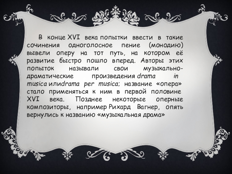 оперу на тот путь, на котором её развитие быстро пошло вперед. Авторы этих попыток называли свои музыкально-драматические произведения drama in musica илиdrama per musica; название «опера» стало применяться к ним в первой половине XVI века. Позднее некоторые оперные композиторы, например Рихард Вагнер, опять вернулись к названию «музыкальная драма»