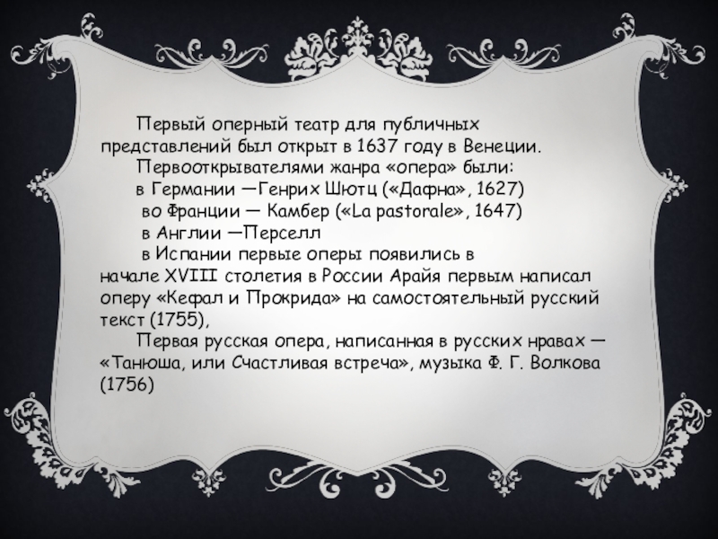 Слайд 7Первый оперный театр для публичных представлений был открыт в 1637 году в