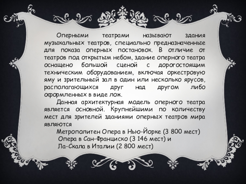 Слайд 11Оперными театрами называют здания музыкальных театров, специально предназначенные для показа оперных