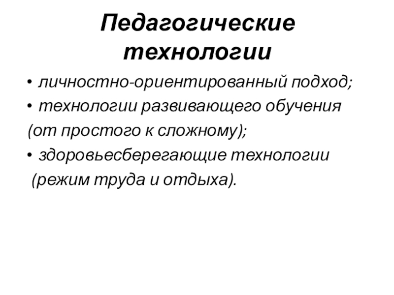 Педагогические технологииличностно-ориентированный подход;технологии развивающего обучения (от простого к сложному);здоровьесберегающие технологии (режим труда и отдыха).