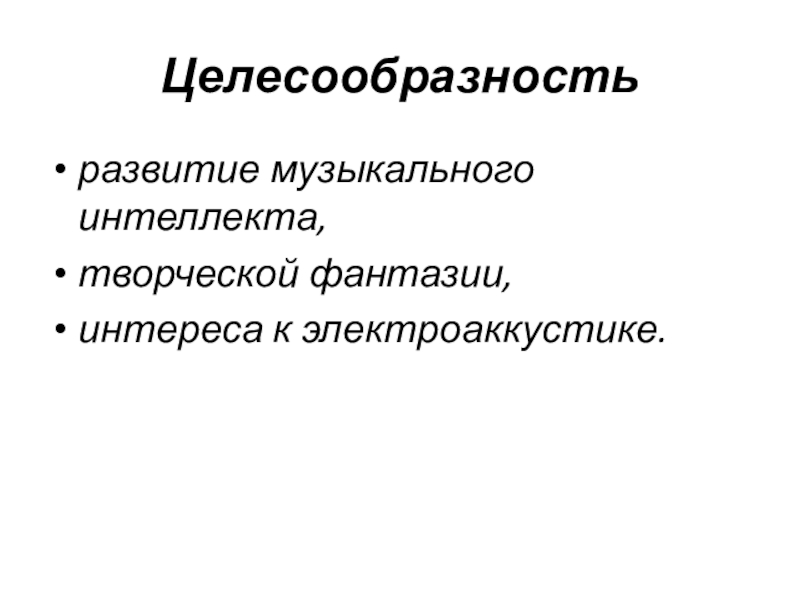 Целесообразностьразвитие музыкального интеллекта,творческой фантазии,интереса к электроаккустике.