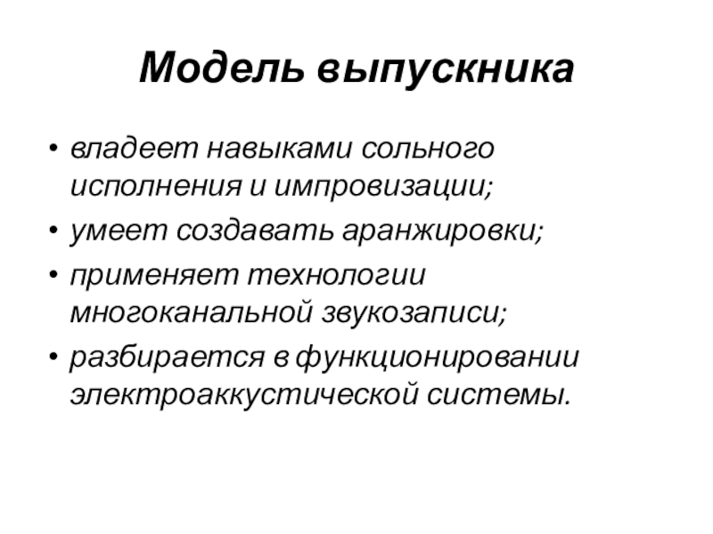 Модель выпускникавладеет навыками сольного исполнения и импровизации;умеет создавать аранжировки;применяет технологии многоканальной звукозаписи;разбирается в функционировании электроаккустической системы.