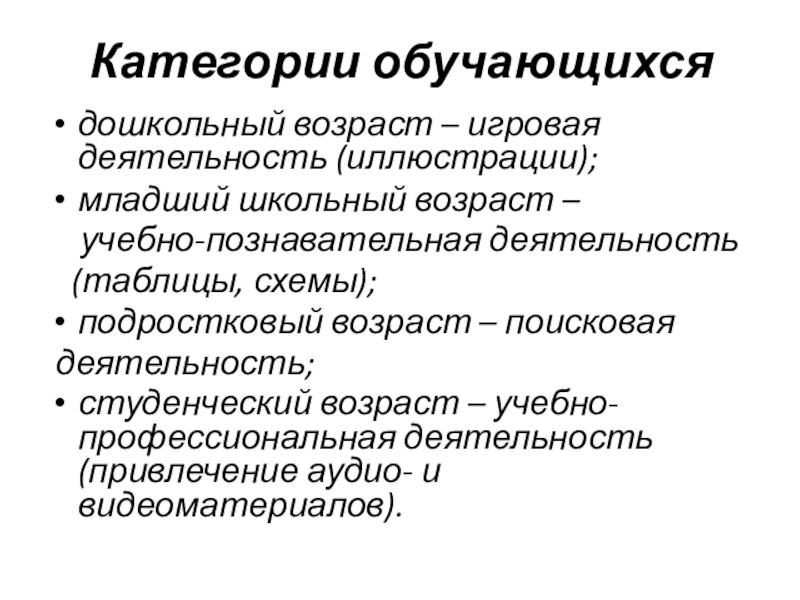 Категории обучающихсядошкольный возраст – игровая деятельность (иллюстрации);младший школьный возраст –   учебно-познавательная деятельность  (таблицы, схемы);подростковый