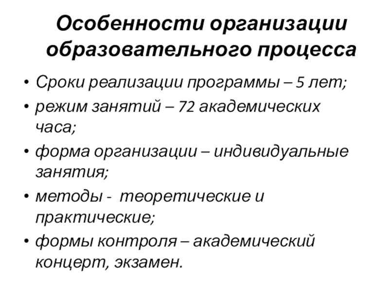 Особенности организации образовательного процессаСроки реализации программы – 5 лет;режим занятий – 72 академических часа;форма организации – индивидуальные
