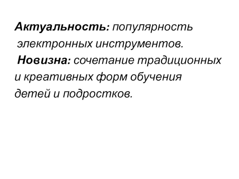 Актуальность: популярность электронных инструментов. Новизна: сочетание традиционныхи креативных форм обучения детей и подростков.