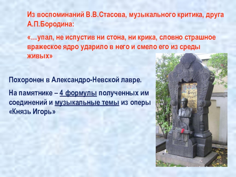 На памятнике – 4 формулы полученных им соединений и музыкальные темы из оперы «Князь Игорь»