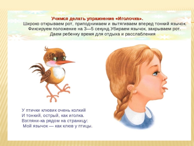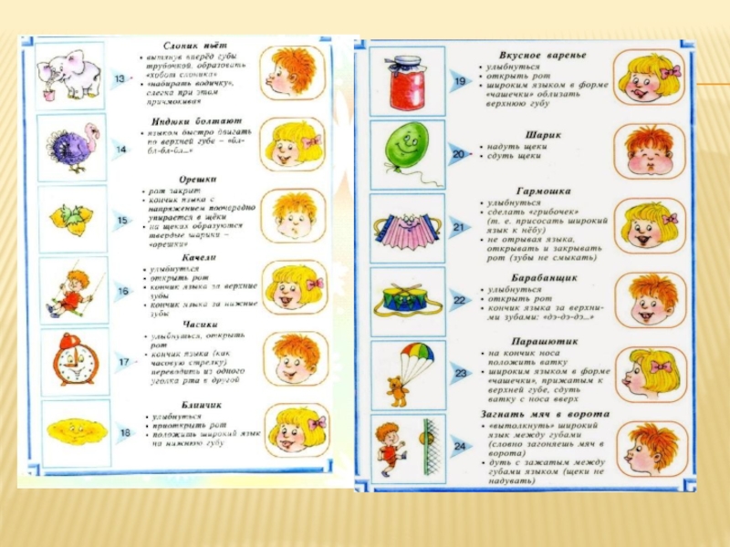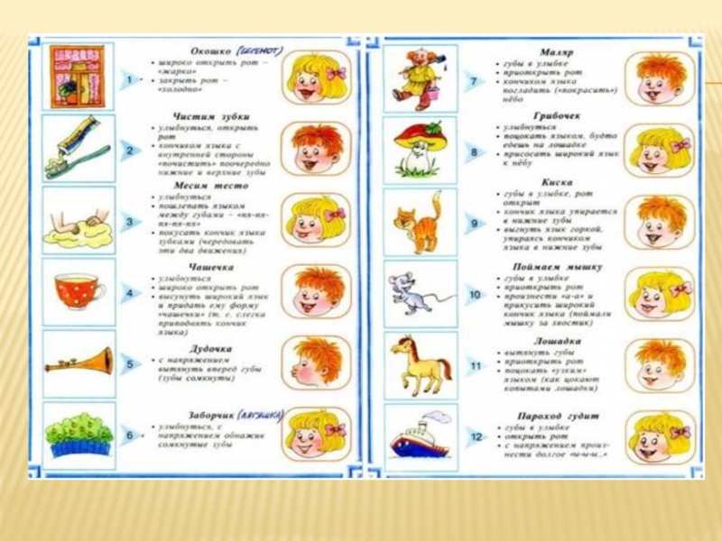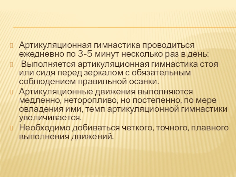 Артикуляционные движения выполняются медленно, неторопливо, но постепенно, по мере овладения ими, темп артикуляционной гимнастики увеличивается.