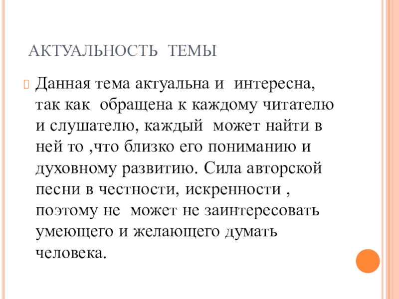 Визбора, Евгения Клячкина, Владимира Высоцкого, Юлия Кима и многих других. Они поются и сегодня в дружеских компаниях, у костра, в походах, геологических экспедициях, в неформальной обстановке. Эта «неформальность» авторской песни и составляет ее главную притягательную силу. Авторская песня обращена к каждому, она про каждого ,и потому ее интимность не противоречит массовости.