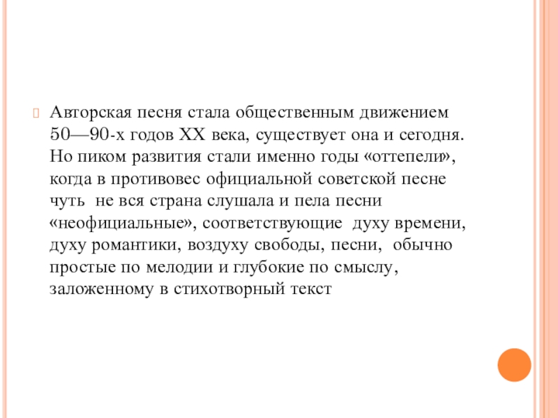 и сегодня. Но пиком развития стали именно годы «оттепели», когда в противовес официальной советской песне чуть не вся страна слушала и пела песни «неофициальные», соответствующие духу времени, духу романтики, воздуху свободы, песни, обычно простые по мелодии и глубокие по смыслу, заложенному в стихотворный текст