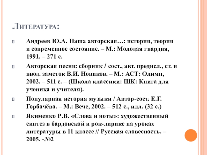 Якименко Р.В. «Слова и ноты»: художественный синтез в бардовской и рок-лирике на уроках литературы в 11 классе // Русская словесность. – 2005. -№2