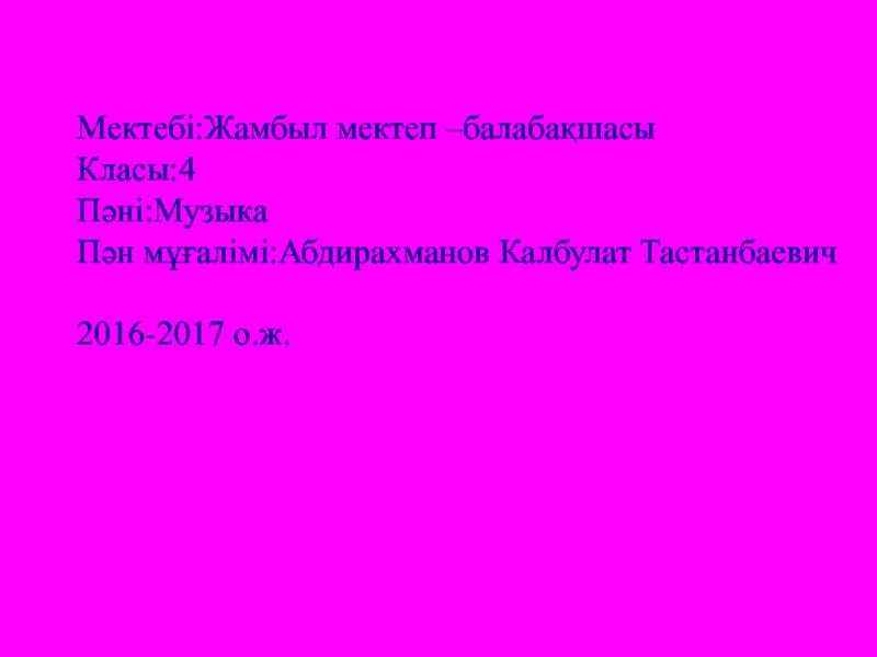 Мектебі:Жамбыл мектеп –балабақшасыКласы:4Пәні:МузыкаПән мұғалімі:Абдирахманов Калбулат Тастанбаевич2016-2017 о.ж.