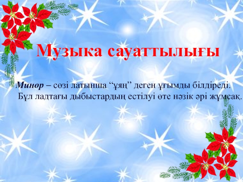 Музыка сауаттылығыМинор – сөзі латынша “ұяң” деген ұғымды білдіреді. Бұл ладтағы дыбыстардың естілуі өте нәзік әрі жұмсақ.