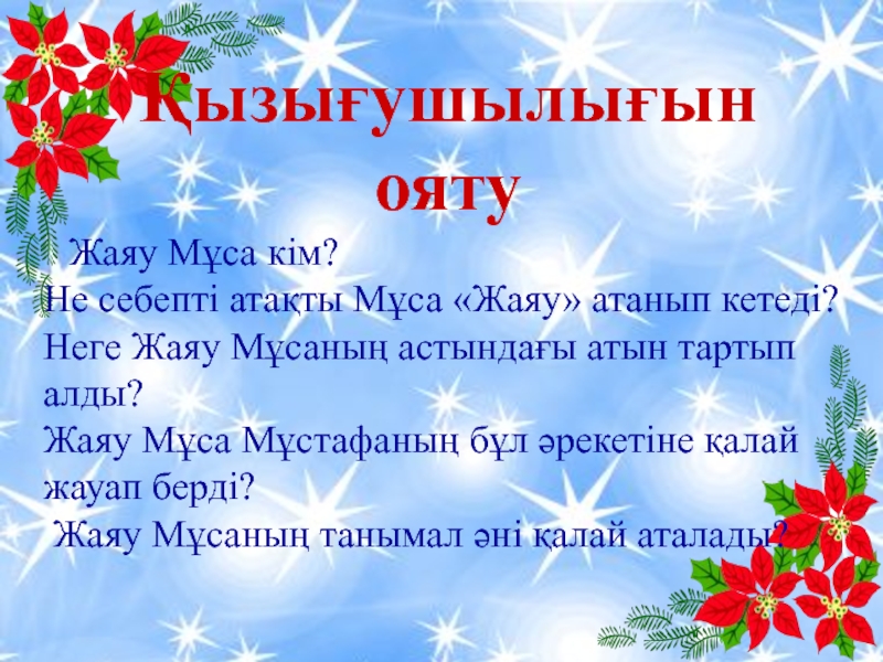 Қызығушылығын ояту Жаяу Мұса кім?Не себепті атақты Мұса «Жаяу» атанып кетеді?Неге Жаяу Мұсаның астындағы атын тартып алды?Жаяу Мұса Мұстафаның бұл әрекетіне қалай жауап берді? Жаяу Мұсаның танымал әні қалай аталады?