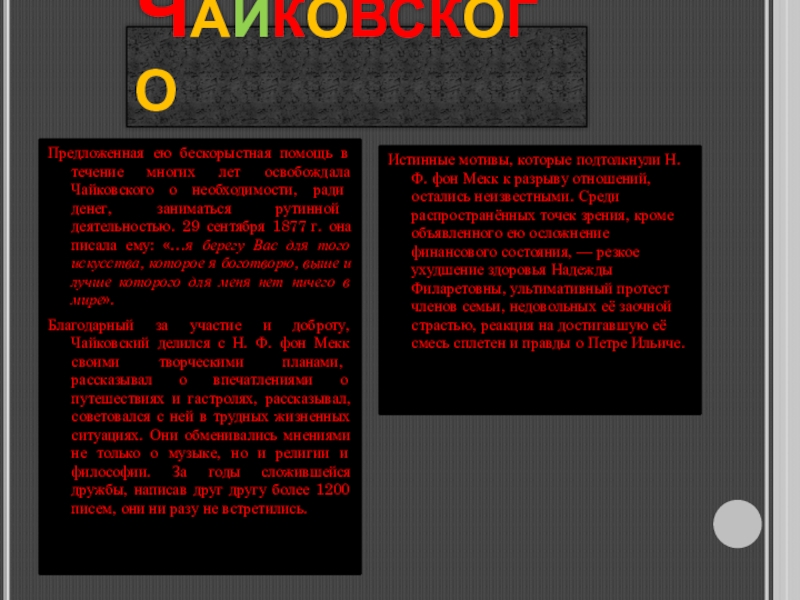 Слайд 5Предложенная ею бескорыстная помощь в течение многих лет освобождала Чайковского о
