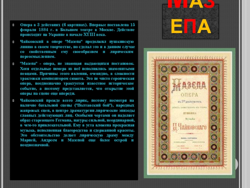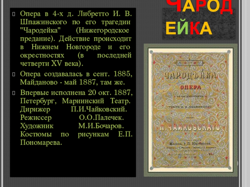 Опера в 4-х д., 6-ти к. Либретто Чайковского по одноименной